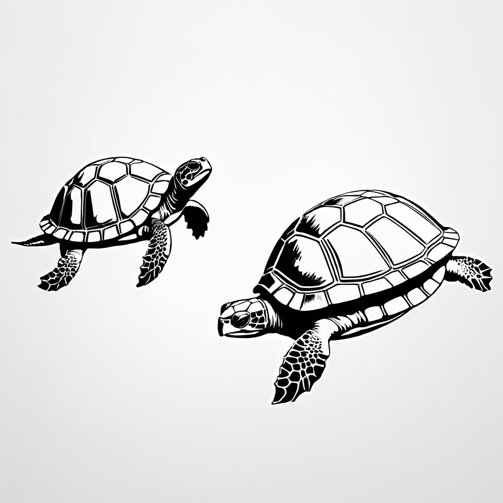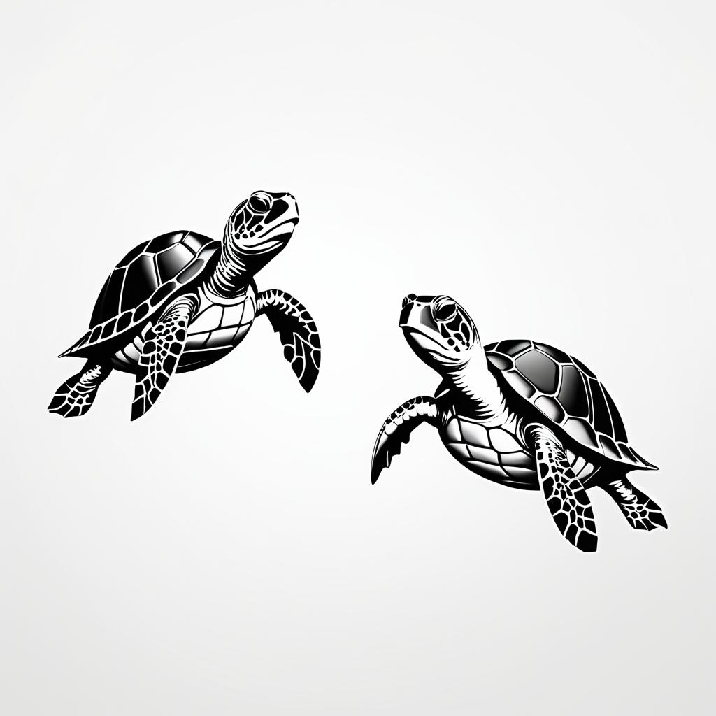 Black and white minimalist pencil drawing illustration of two turtles, depicted with simple and elegant line art. Features are stylized with clear, bold patterns on the turtles’ shells and flippers, shown with reflective water surface underneath.