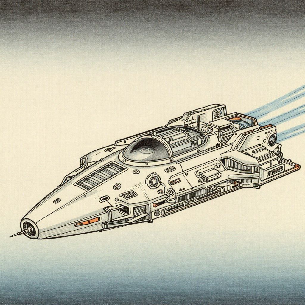 Style transfer AI blending traditional Japanese ukiyo-e style with a modern sci-fi spaceship design, delicate linework, flowing waves and clouds, subtle color gradients, merging cultural heritage with futuristic elements in elegant digital art