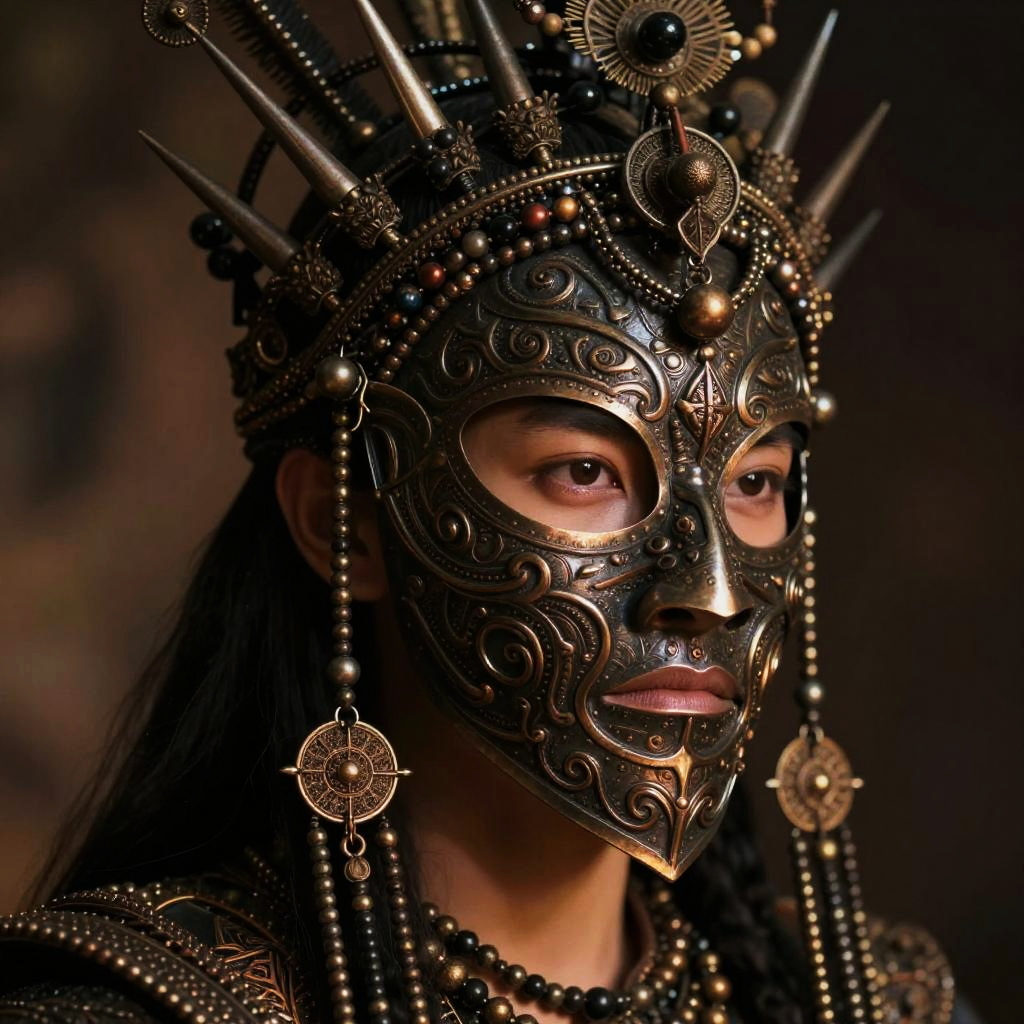 A dark fantasy portrait of a regal tribal figure wearing an intricate headdress made of metal spikes and chains, adorned with detailed metalwork and beads. The figure's face is partially covered with a dark, ornately carved metallic mask, revealing intense eyes. The background features warm, moody lighting that highlights the metallic textures and bronze and black color tones. Close-up, cinematic atmosphere, highly detailed craftsmanship, fantasy art style.