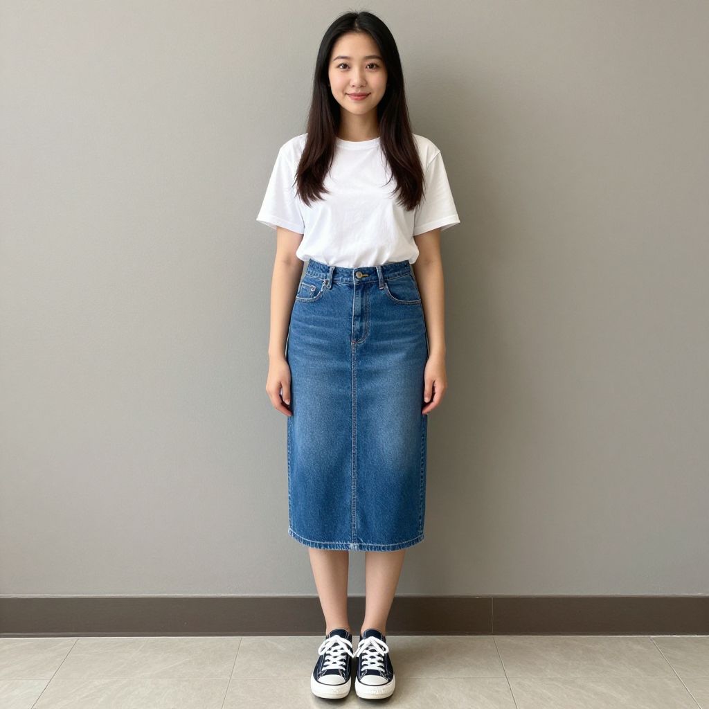 "jeans skirt costume, 1girl, solo, realistic, denim skirt, skirt, denim, shirt, long hair, photorealistic, white shirt, standing, shoes, full body, asian, looking at viewer, sneakers, brown hair, black hair, short sleeves, smile, lips, t-shirt, brown eyes Realistic photo of casual sexy person with pretty face"