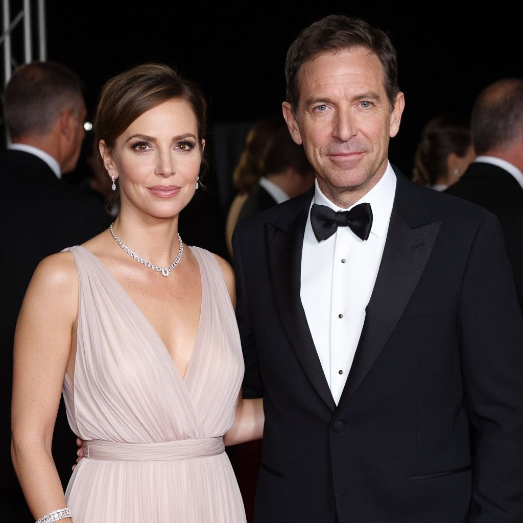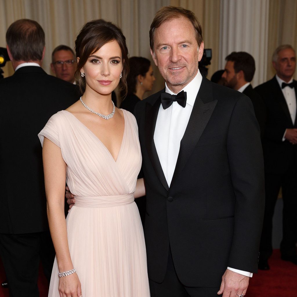 Photograph of a formal event featuring a fair-skinned woman with dark brown hair in an elegant, off-shoulder, pale pink gown with a deep V-neckline and a cinched waist. She wears a sparkling necklace and bracelet. Standing beside her is a fair-skinned, middle-aged man with light brown hair in a black tuxedo with a white shirt and black bow tie. They stand in the foreground, with several other formally dressed men in black suits and bow ties in the background. The setting is an indoor venue with white drapes and a red carpet. The lighting is bright, highlighting their attire.