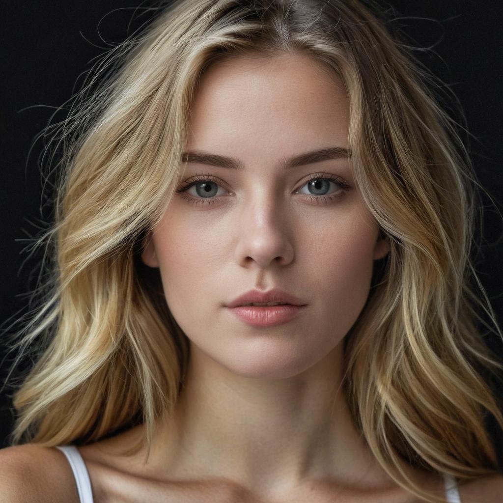 Close-up portrait of a young Caucasian woman with long blonde hair and grey eyes, looking directly at the camera. She has natural makeup with a neutral lip, light freckles, and wears a white camisole with bare shoulders against a black background.