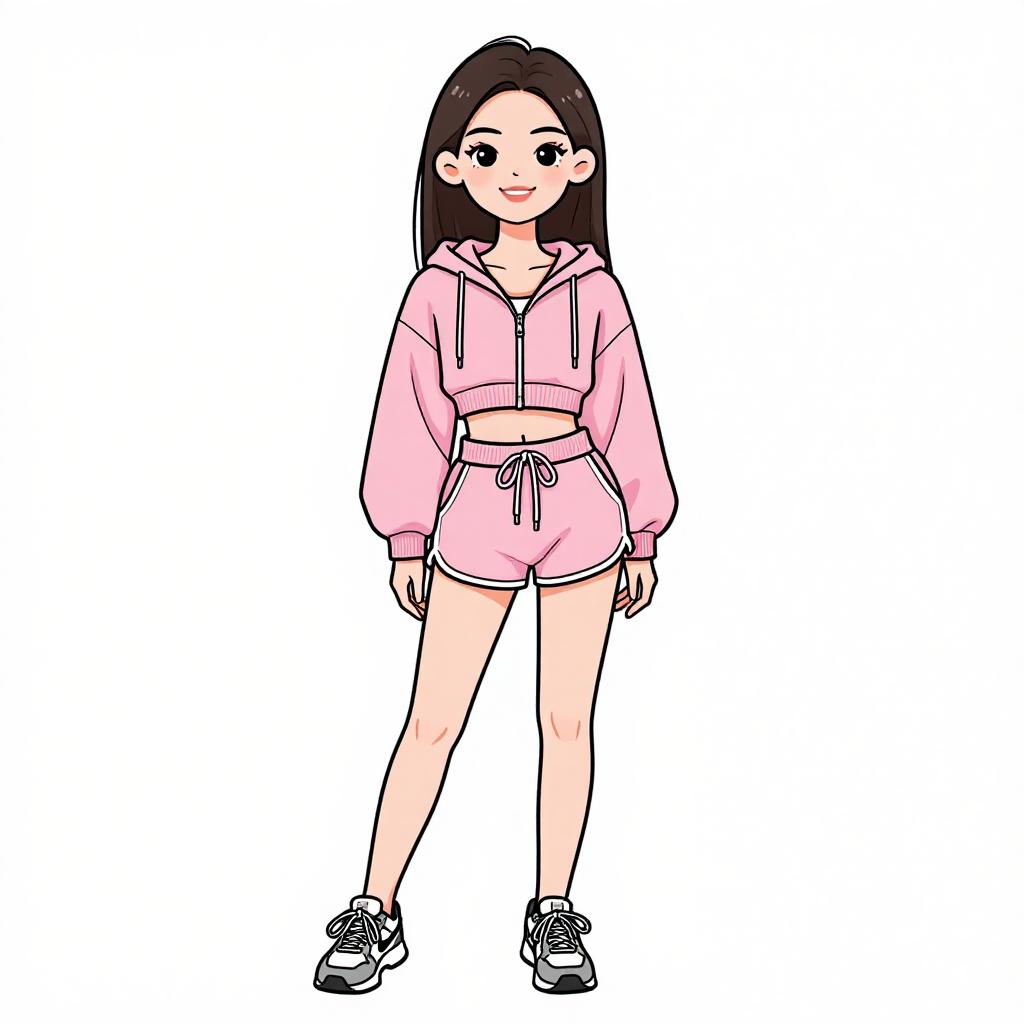 Woman with pretty face and pretty hair. smiling Woman, casual sporty, pale pink velour tracksuit, hoodie with zipper, drawstring shorts, white cropped tank top underneath, clean white low-top sneakers, long straight hair, studio background --sref 1467
