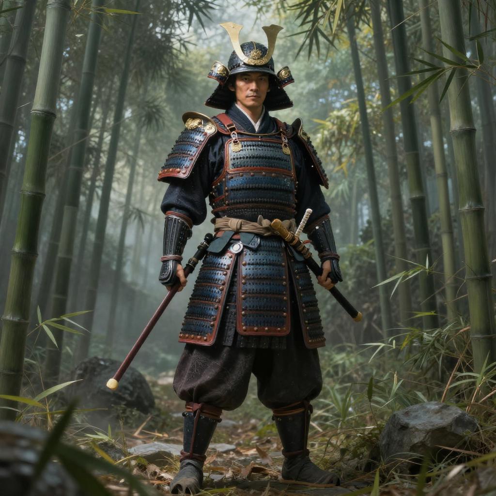 Modelshoot style, (extremely detailed CG unity 8k wallpaper), full body shot of armored samurai warrior, misty ancient bamboo forest, professional majestic oil painting by Rembrandt and Gustav Klimt, Studio Ghibli, trending on ArtStation and CGSociety, intricate, high detail, sharp focus, cinematic lighting, photorealistic art by midjourney and Greg Rutkowski
