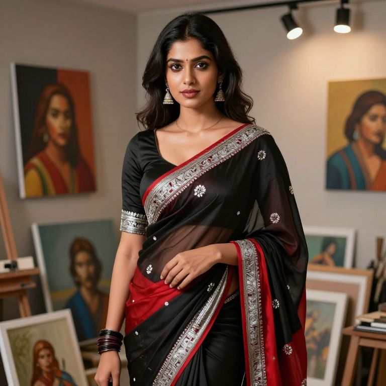 A modern artist with a sharp jawline and dark, expressive eyes, wearing a bold kandangi saree in black and crimson with silver zari embroidery, standing in a trendy art studio in Chennai, surrounded by painted canvases and lights