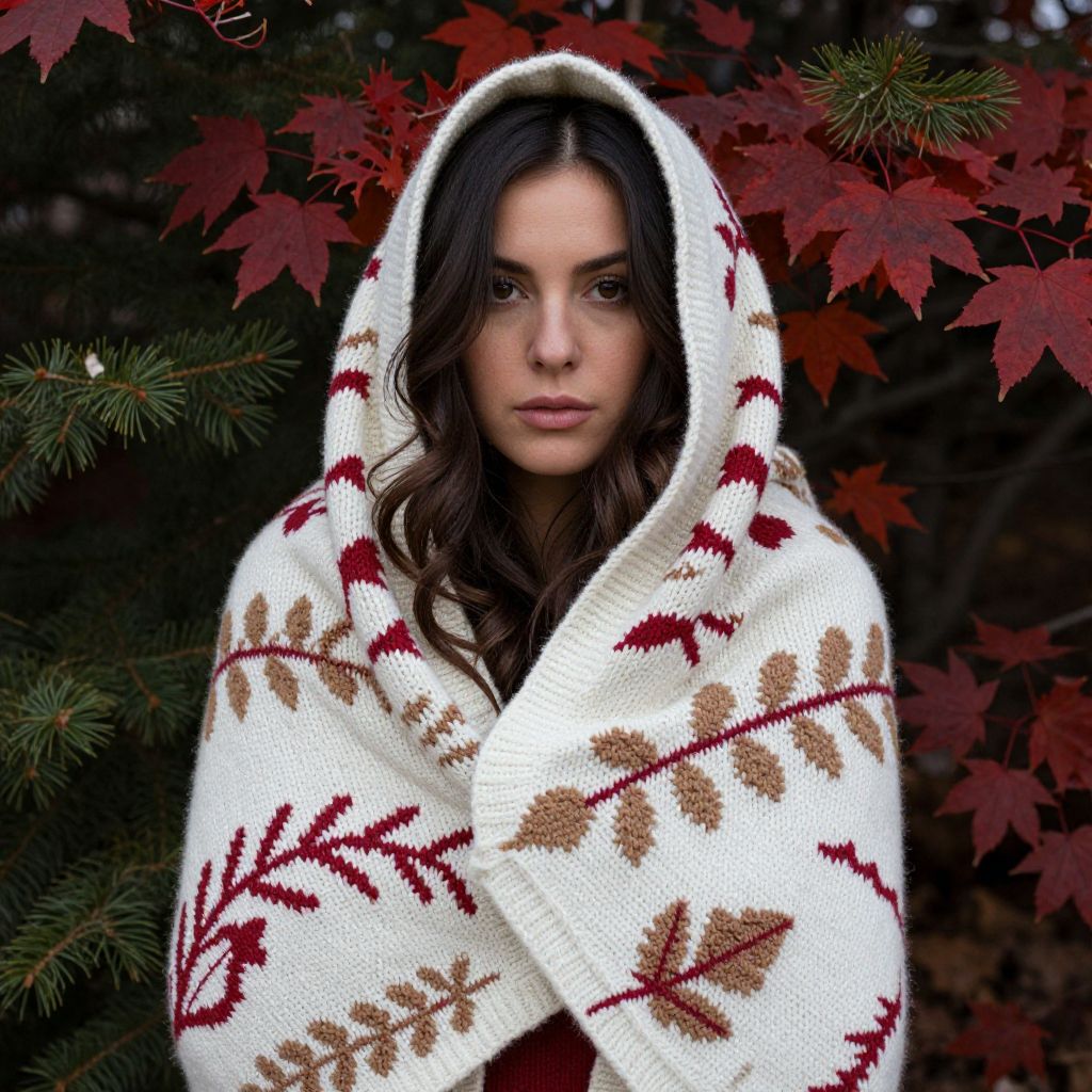 The image depicts a woman wrapped in a cozy, knitted blanket adorned with intricate patterns of leaves and branches. The blanket is predominantly white with red and brown accents, creating a warm and inviting atmosphere. The woman's hood is lined with soft, fluffy material, adding to the sense of comfort and protection. Her hair, long and dark, flows freely, partially obscured by the hood. Surrounding her head are red maple leaves and evergreen branches, suggesting a connection to nature and perhaps a nod to the Canadian landscape. The overall composition is balanced, with the woman centrally positioned, and the elements of the blanket and leaves creating a harmonious blend of textures and colors. The background is dark, which contrasts with the bright, detailed patterns on the blanket, making the woman and her surroundings the focal point of the image.