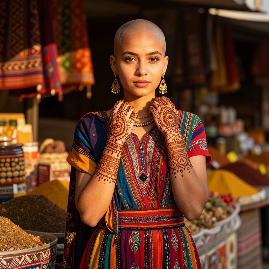 Bald Indian girl standing in a vibrant traditional market, wearing colorful ethnic attire, intricate henna designs on her hands, warm golden sunlight casting soft shadows, rich textures of fabrics and spices around her, expressive and confident expression.