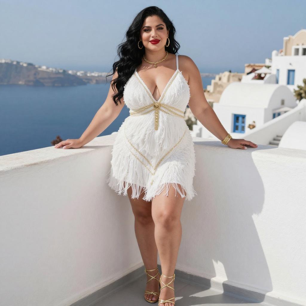 Photograph of a curvy woman with long black hair, wearing a white, fringed, deep V-neck mini dress with gold accents, and gold strappy sandals. She stands on a balcony with a bright blue sea and white buildings in the background. She smiles, with red lipstick and gold jewelry, including a necklace and bracelet.