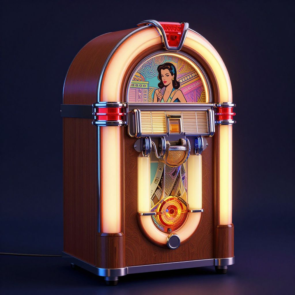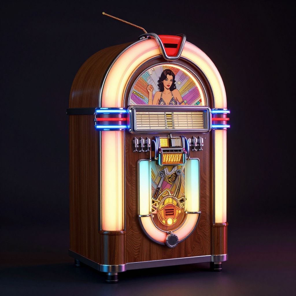 A vibrant 3D-rendered jukebox featuring retro-inspired design elements, illuminated with neon lighting and adorned with a classic illustration of a woman, showcasing a high-definition, vintage aesthetic reminiscent of mid-century Americana.