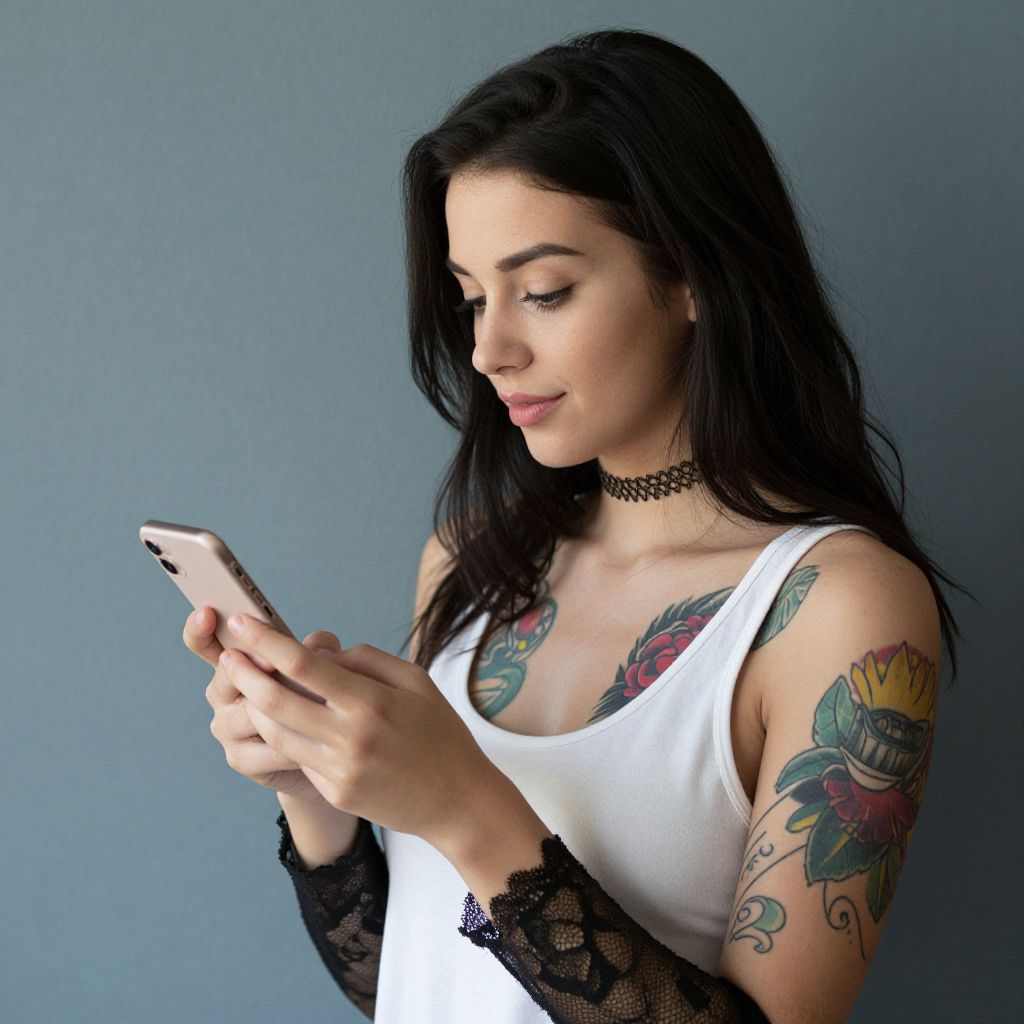 A photograph of a young woman with long, dark brown hair and light skin, wearing a white tank top and black lace sleeves. She's holding a smartphone in her right hand, looking at its screen with a slight smile. Her chest and arms feature colorful tattoos. The background is a textured, teal-gray wall. She has a black choker necklace around her neck.