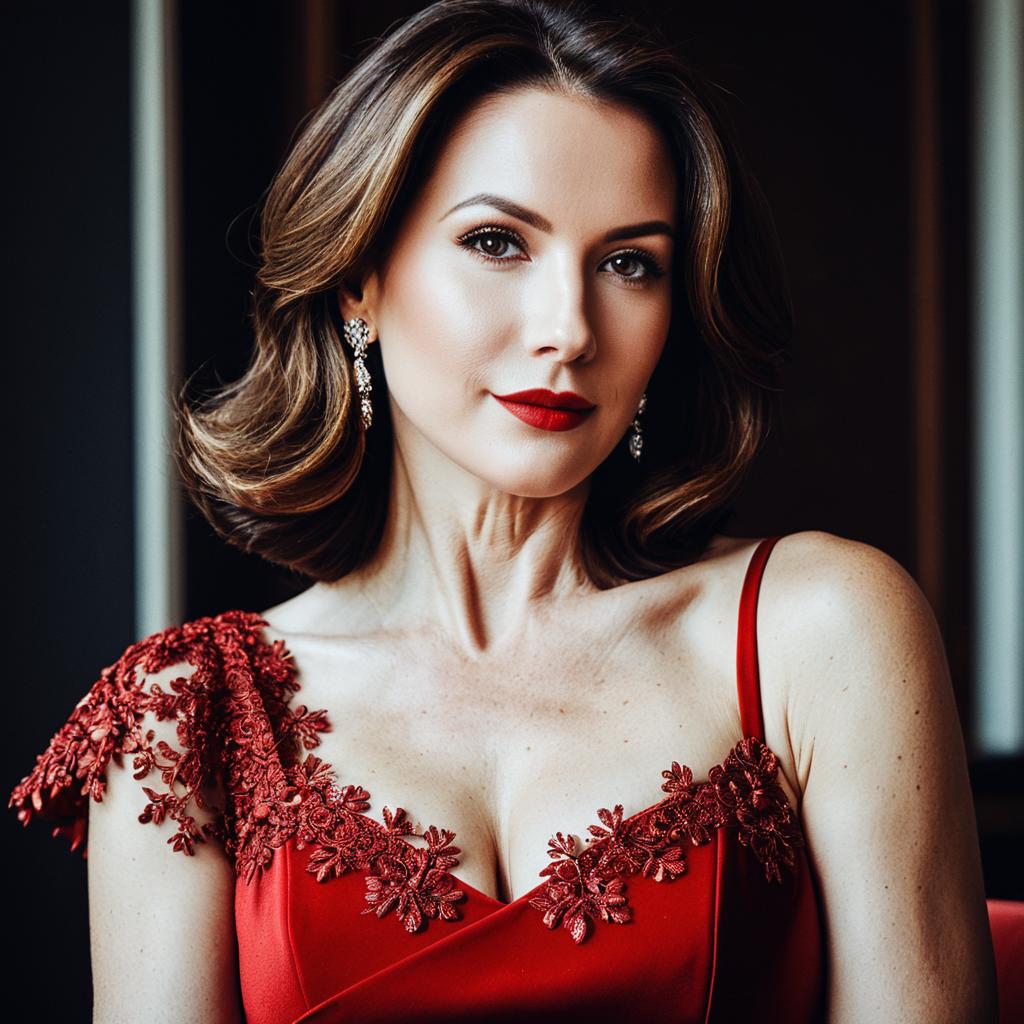 Realistic photo.Macro photograph of a stunning woman, 41 years old, with shoulder-length brown hair, wearing an elegant red cocktail dress, high realism, editorial photography with intricate details.