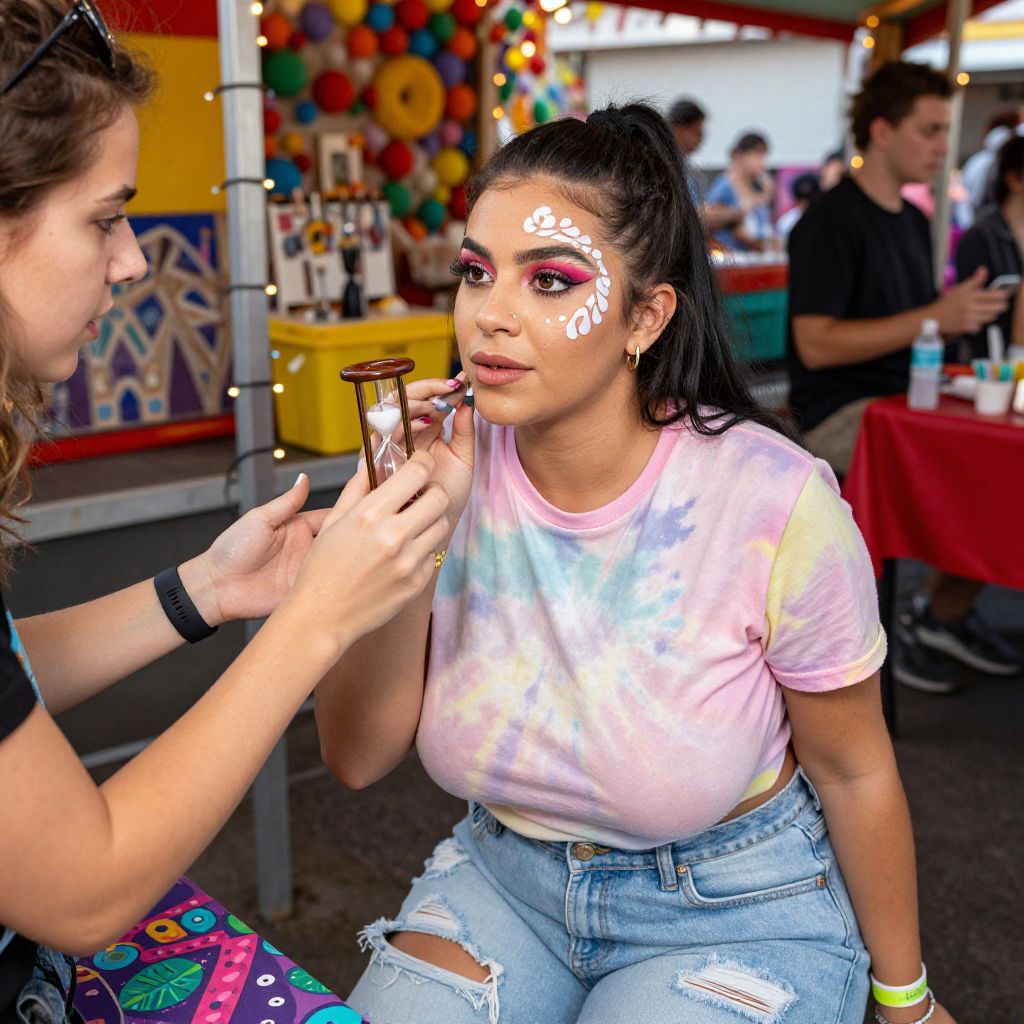 A hourglass woman in casual streetwear, wearing a pastel tie-dye t-shirt and light-wash distressed jeans, is enjoying a vibrant street carnival face painting. The visual style is an overhead shot, capturing the colorful atmosphere and her joyful expression as she interacts with the artist under string lights. Sexy. Pretty face and beаutiful eyes. Big breasts
