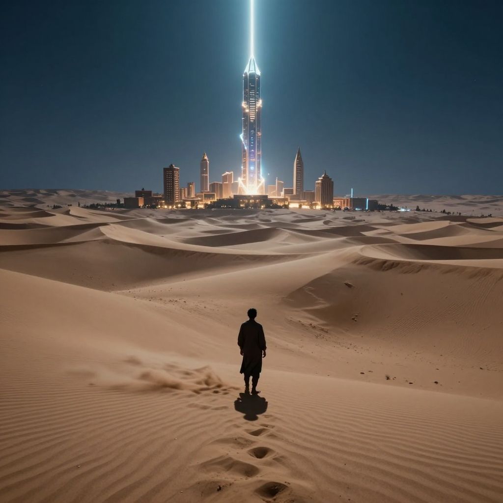 (mysterious desert man) (at a distance from viewer) overlooking a vast desert, sea of infinite sand dunes in the clear night sky, cool winds blow the sands across, midground desert city with building made of (ral-crztlgls) and a mystical powerful beam of light emitting to the sky from a crystal skyscraperimage is high resolution with very high details of the sand, details of sand particles being blown by the wind. Dramatic lighting with realistic special effects in style of Hollywood movies