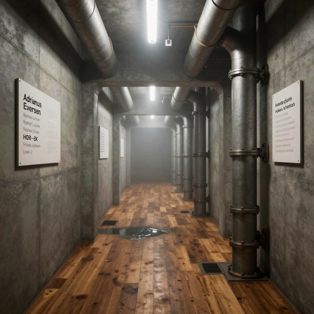 Backroom, liminal space, uploaded artstation, by Adrianus Eversen, by Raphael Lacoste, by Frederic Church, by Andreas Achenbach, Level-2, Pipe Dreams, inside, pipeline, engineering, pipe, basement, wooden floor, corridor, infinity corridor, concrete wall, , sci-fi, fog, shadow, water, (photorealistic), [sharp focus], (HDR), (8k), (gigapixel), (masterpiece)