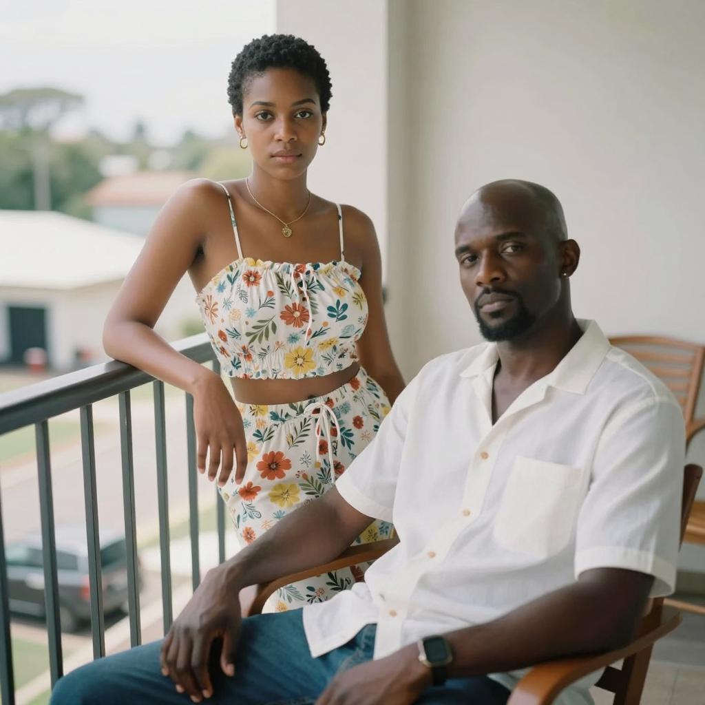 Portrait of a Black man and woman on a balcony. The woman stands with her arm resting on the railing, wearing a white floral crop top and matching skirt, gold hoop earrings, and a necklace. She has short curly hair and a calm expression. The man sits in a wooden chair, dressed in a white short-sleeve button-up shirt and jeans, with a bald head and a serious expression. The background is blurred, showing outdoor elements and chairs, captured in a soft, film-style photography.