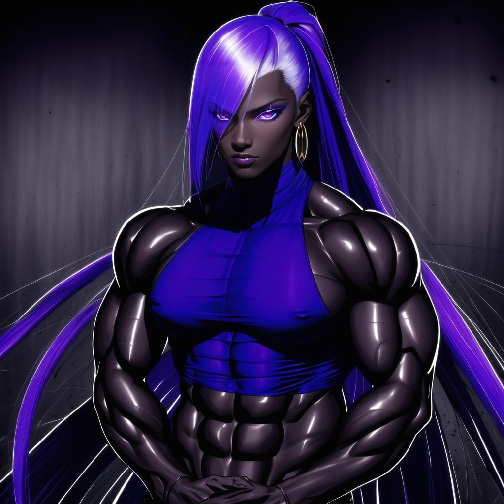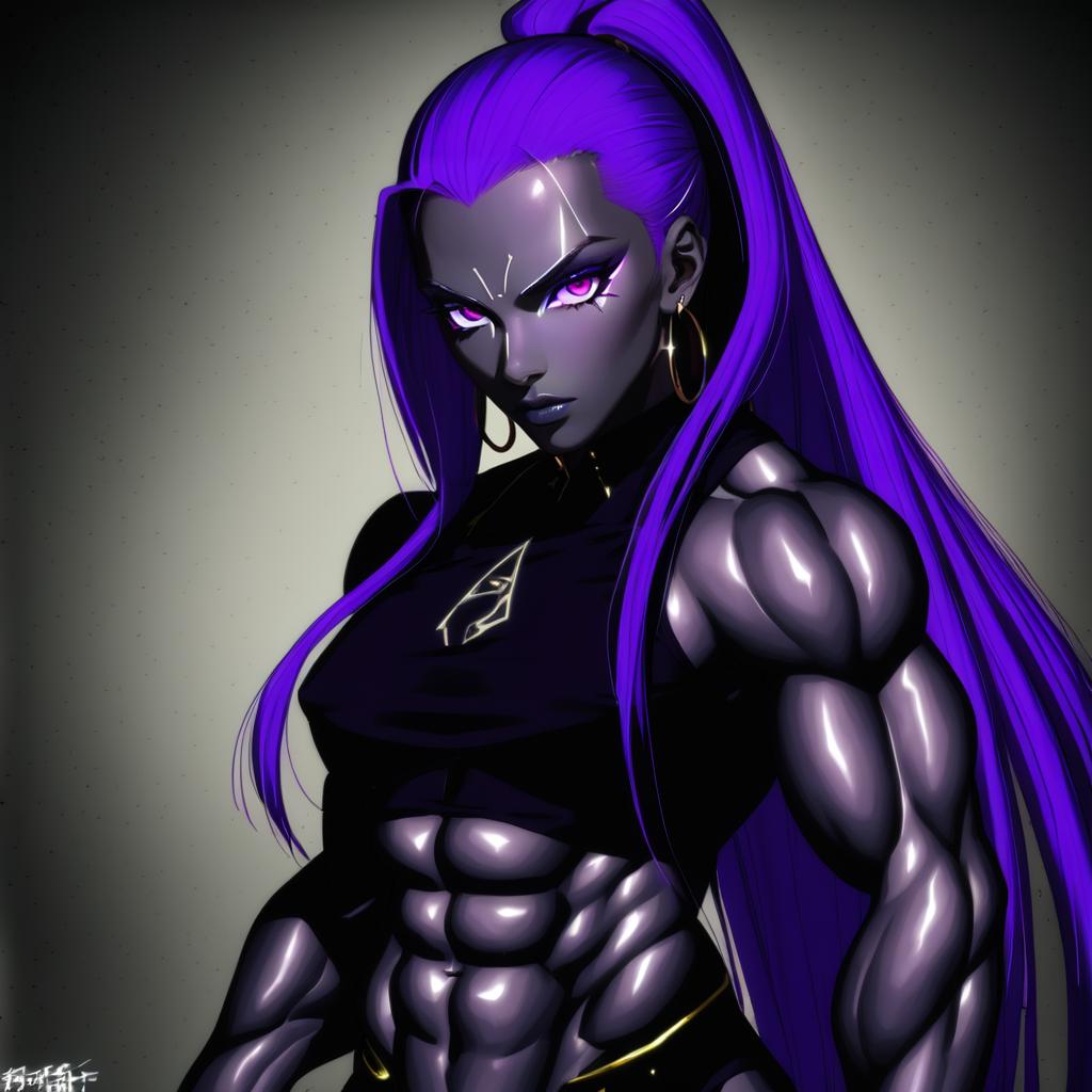 Assassin (fate/zero), fate (series), 1girl, dark-skinned female, grey skin, very dark skin, purple eyes, purple hair, very long hair, long hair, ponytail, medium breasts, hoop earrings, abs, muscular female, by artist nyamota, leet
