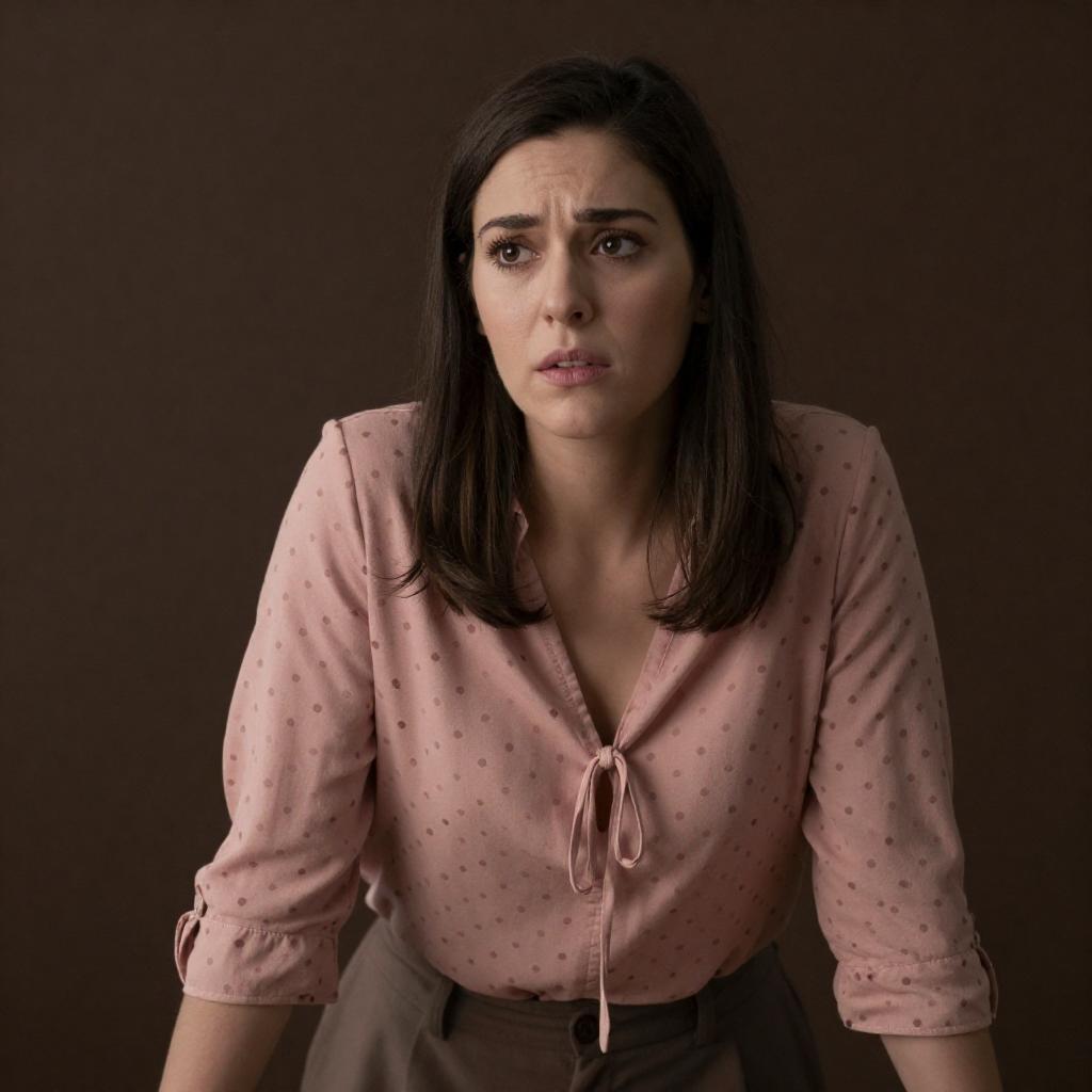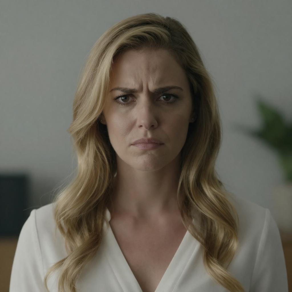 Photograph of a serious-looking woman with long, dark brown hair and light brown highlights, wearing a blue button-up shirt. She has a focused expression, slightly furrowed brows, and is looking to the side. The background is blurred, featuring neutral tones. Her skin is fair, and the lighting is soft.
