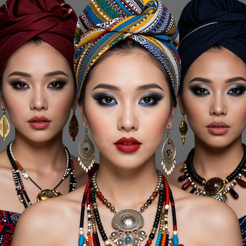 Close-up portrait of Asian Latina women with bold makeup, intricate jewelry, and colorful headwraps, studio lighting, high-resolution detail, striking contrast, contemporary ethnic fashion fusion.