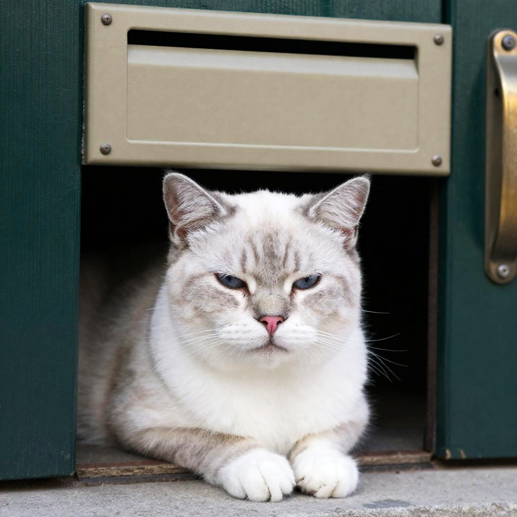 Gray and white cat with a grumpy expression, lying under a beige mail slot on a green wooden door. Cat's front paws rest on the ground, head pushed forward, blue eye half-closed, pink nose, white whiskers. Door has a brass handle on the right.