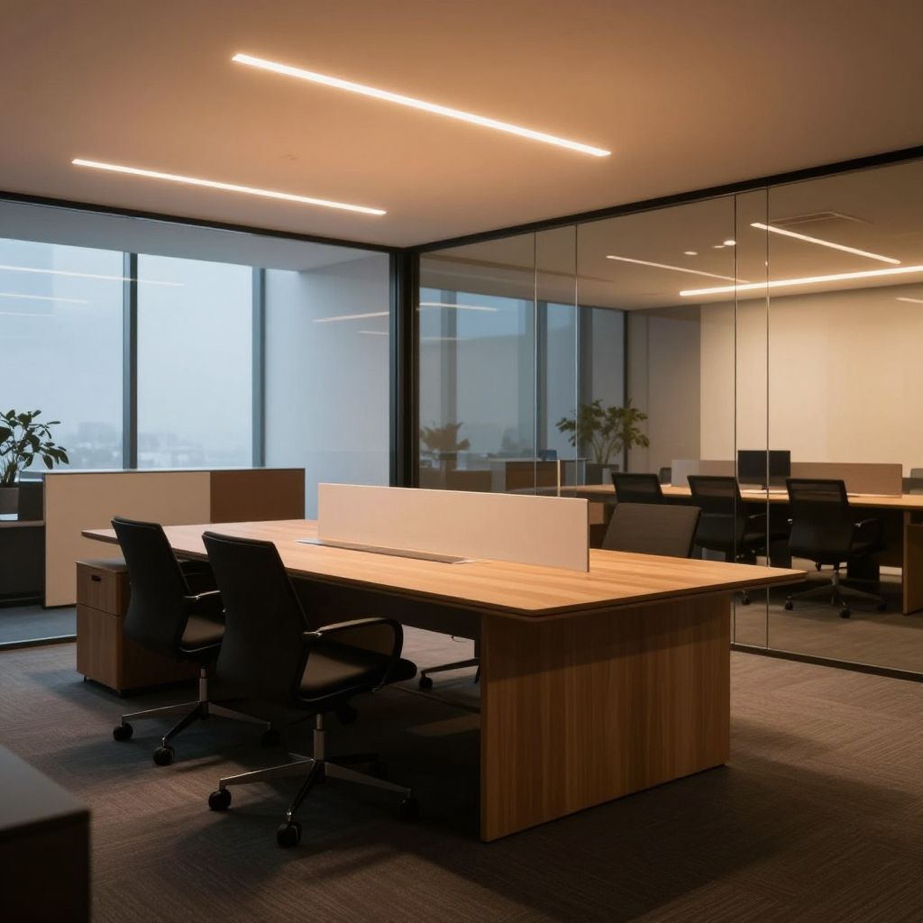 Corporate office room at dusk, illuminated by soft LED lights, sleek minimalist furniture, glass meeting room in background, warm wood accents, tech gadgets visible, calm and productive atmosphere
