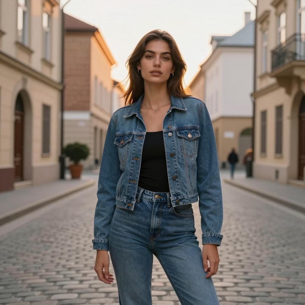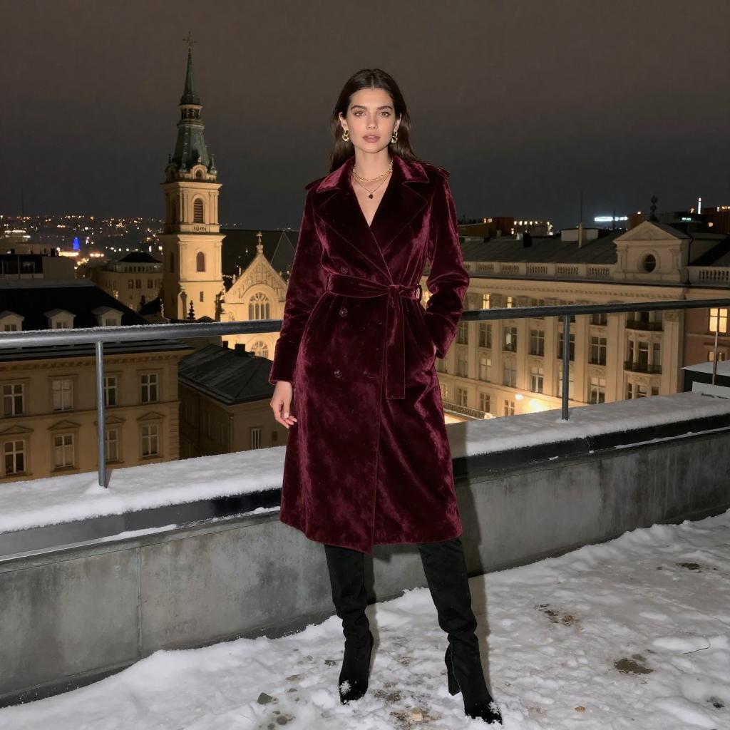 Stylish young woman wearing a burgundy velvet coat with a belt, black pants, and heeled boots standing on a snow-dusted rooftop terrace at night. The illuminated cityscape with historic buildings and a church spire is visible in the background. She accessorizes with gold earrings and layered necklaces.