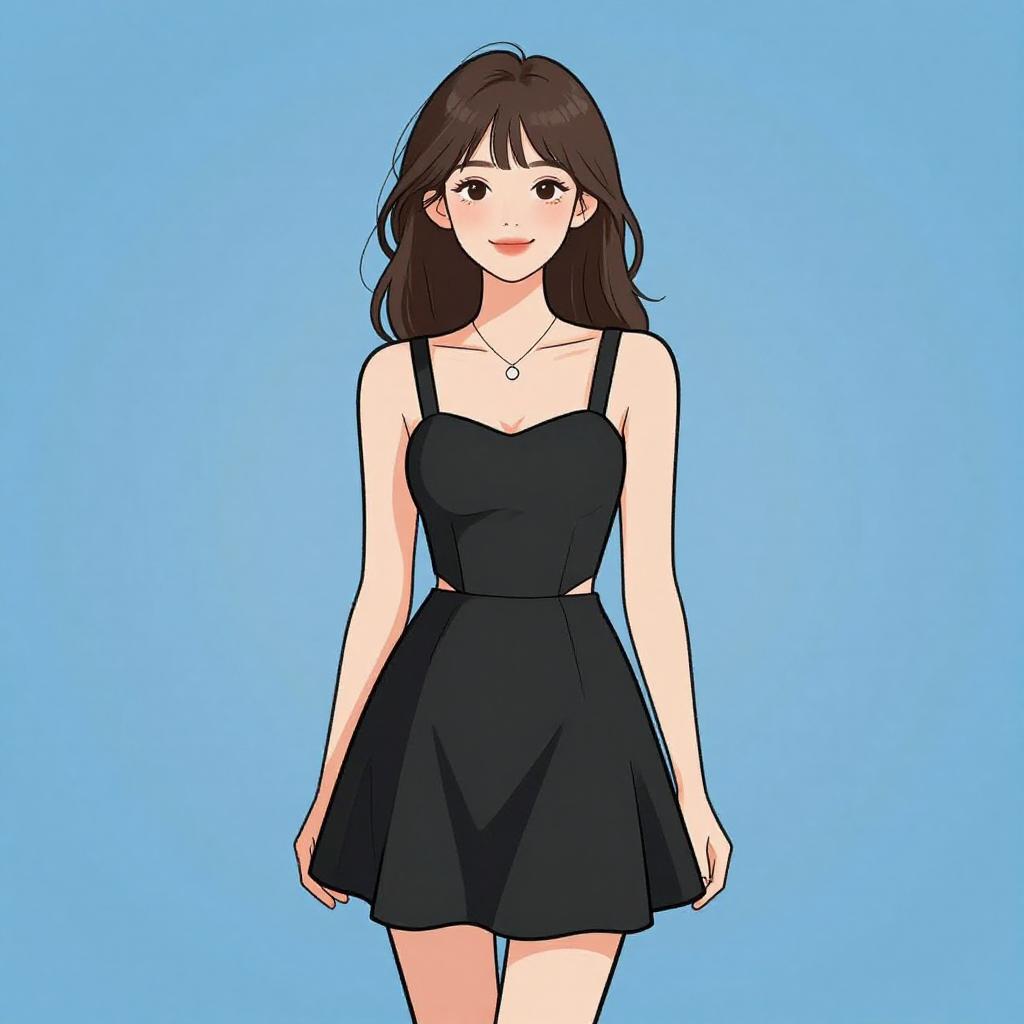 Digital anime-style drawing of a young woman with fair skin and long, straight, dark brown hair. She has large, expressive brown eyes, a small, pink smile, and a slender, attractive figure. She wears a tight, short black dress with a small, keyhole-style cutout above the chest, accentuating her medium-sized breasts. The dress clings to her curves, ending mid-thigh. She stands against a plain white background, with her arms relaxed at her sides. The artwork has clean, bold lines and a flat color palette, typical of anime illustrations.