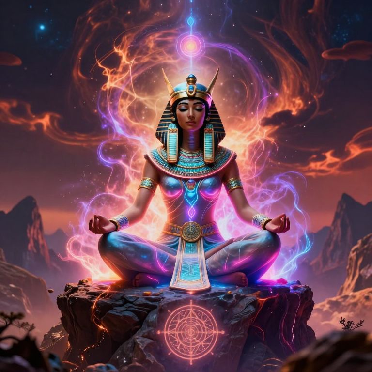 Digital artwork of a serene, dark-skinned goddess with an Egyptian headdress, seated in lotus position on a rocky peak, surrounded by vibrant,