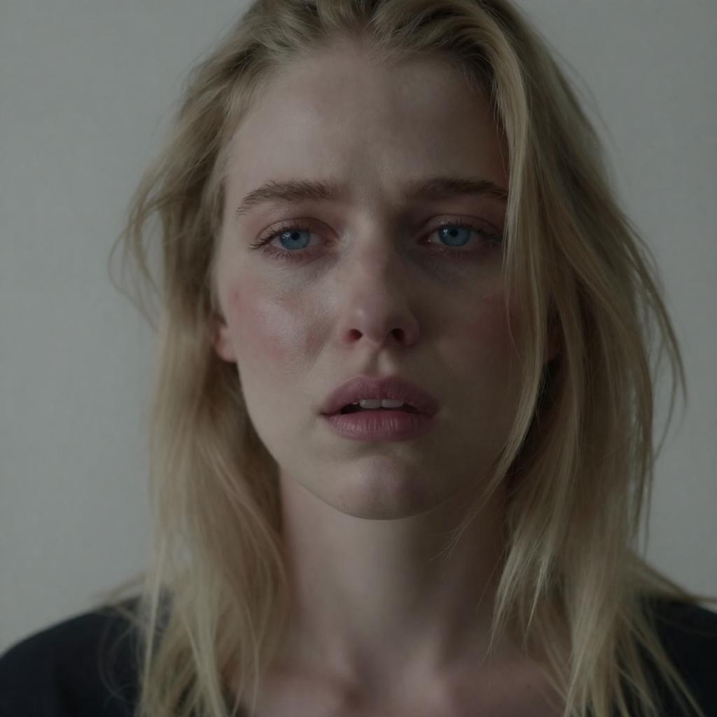 Close-up of a pale-skinned woman with blue eyes, messy blonde hair partially covering her face, and a bruised left cheek. She has a distressed expression with slightly parted lips. Soft, diffused light in the background. She is wearing a dark top. The image focuses on her face and upper chest.