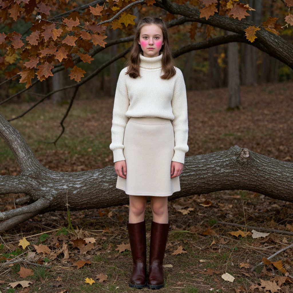 A teenage girl in a realistic portrait wearing a 'girls fall outfit costume' at a school field trip in the fall woods; she has a natural makeup look, soft pink cheeks, and light brown eyes, standing next to a fallen oak tree with leaves forming a natural canopy; her outfit includes a cream-colored knee-length skirt, a turtleneck sweater, and deep brown boots, styled with a rustic yet fashionable edge.