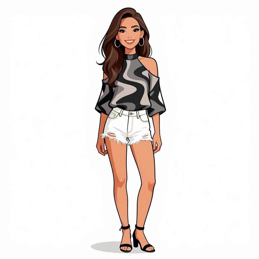 Digital illustration of a young woman with light brown skin and long, wavy dark brown hair. She wears a black sleeveless crop top, a white mini skirt with bold black geometric patterns, and black ankle boots. Her makeup includes bright red lipstick, and she has large, gold hoop earrings. She stands confidently with a slight smile, her arms relaxed by her sides. The background is plain white, emphasizing her stylish outfit and confident pose. The illustration uses bold lines and a limited color palette, with a modern, graphic style.