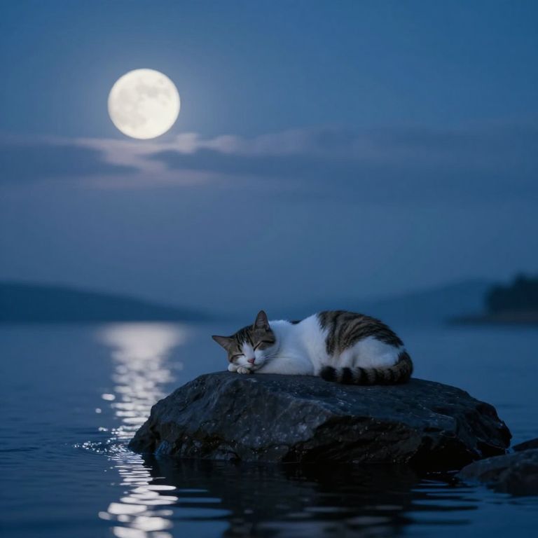 Serenity whispers through the night as a slumbering cat rests upon a solitary rock, its peaceful presence mirroring the calm waters below and the gentle sway of the moonlit clouds above, evoking a profound sense of solitude and timeless peace.