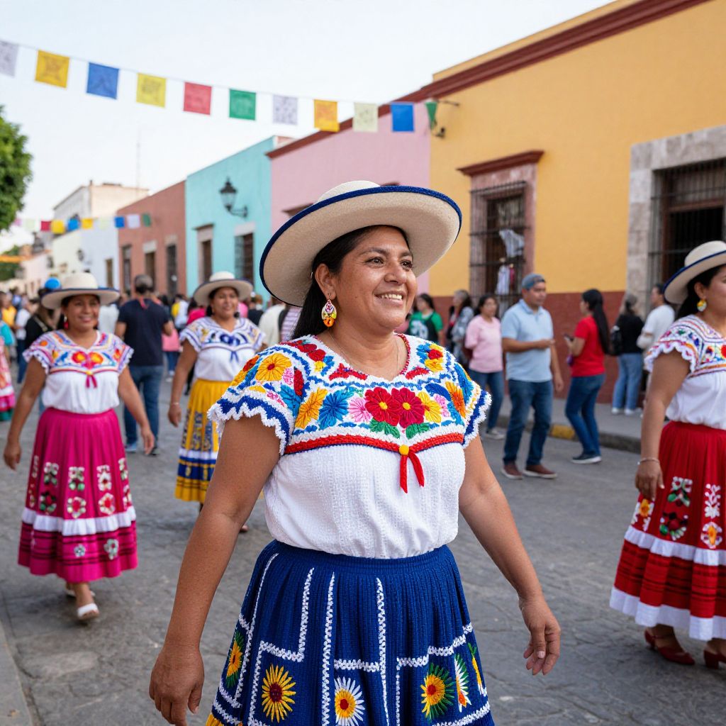 Vibrant streets of Oaxaca come alive during the Guellagüeza festival in July, with a smiling woman in traditional attire leading the scene, her wide-brimmed hat and colorful dress standing out against the bustling crowd and pastel-hued buildings.