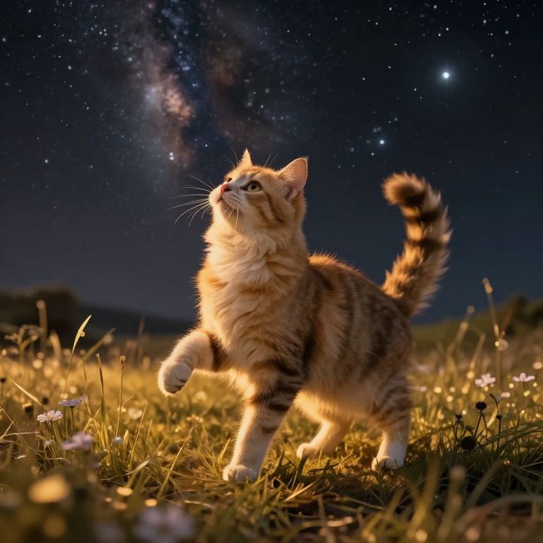 A celestial wanderer, the cat stands serenely atop a field of dreams, its fur bathed in the golden glow of a cosmic dance, embodying the timeless connection between earth and the infinite expanse above.