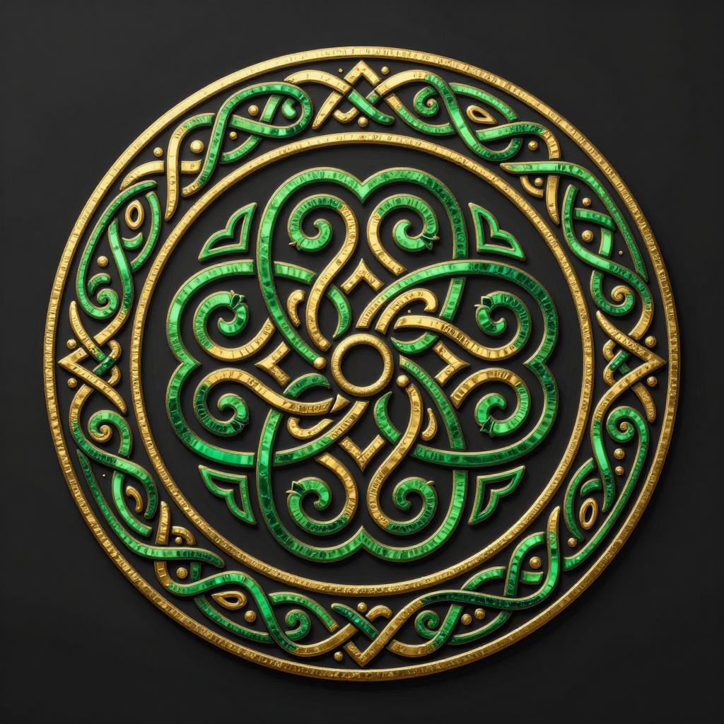 Scrollworks pattern featuring celtic-inspired scrolls interwoven with knotwork bands in emerald green scrollwork on black with subtle glow arranged as central circular medallion of scrollwork on a plain field on digital UI background for a fantasy game rendered as gold foil stamping effect with subtle bevel, ultra-detailed, sharp ornamental design, high resolution, intricate decorative pattern art