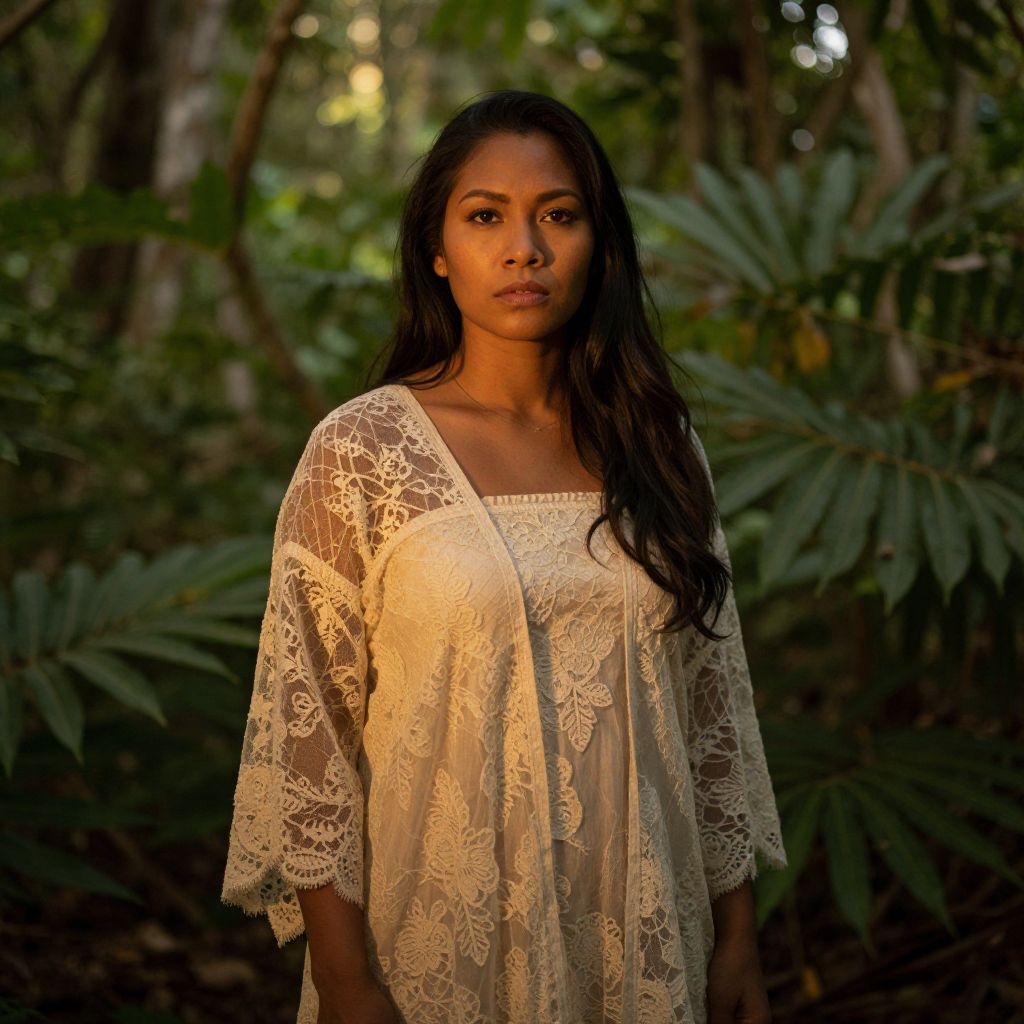 A super-realistic portrait captures the enigmatic essence of a Melanesian woman, her piercing gaze shrouded in an air of mystery and wisdom. Illuminated by soft golden light filtering through the dense forest canopy, she stands out against the vibrant backdrop of verdant leaves and dappled shadows. The intricate play of light on her elegant, timeless attire—delicate lace and flowing fabrics—creates an ethereal aura, inviting viewers to delve into her world and uncover the layers of her transparent character.