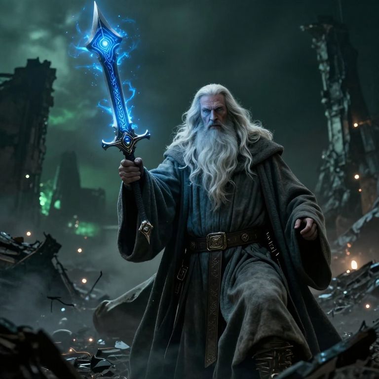 In this apocalyptic future, Gandalf, the wise wizard, stands resolute and powerful, his long white beard and flowing robes contrasting with the dark, smoky atmosphere. He holds a futuristic weapon, its intricate design and glowing blue energy emanating a sense of otherworldly power. The weapon's sharp, ornate blade points upwards, casting a shadow that stretches across the grim landscape. The background is a chaotic blend of ruins and debris, with faint lights and eerie greenish hues adding to the ominous ambiance. Gandalf's hooded cloak, draped over his shoulders, shields him from the harsh environment, while his intense gaze and determined expression reflect his unwavering commitment to his mission. The overall composition is dynamic, with Gandalf positioned centrally, his figure dominating the scene and drawing the viewer's attention to his formidable presence and the mysterious weapon he wields.