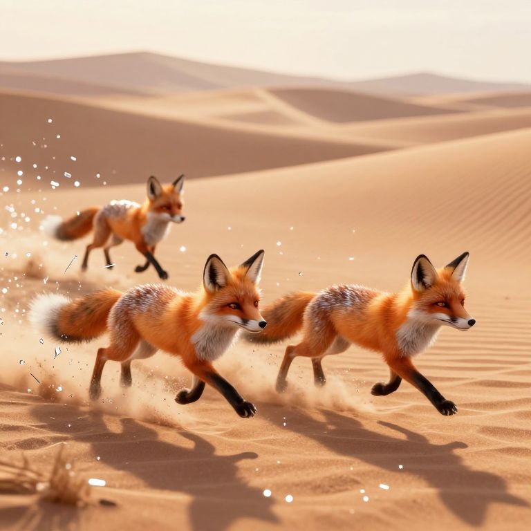 Photograph of three red foxes with vibrant orange fur and white underbellies running through a sunlit, golden sand dune desert. The leading two foxes are in sharp focus, kicking up sand, while the third fox is slightly blurred in the background. Their bushy tails and pointed ears are prominent. Sparkling sand particles are visible around the foxes, adding a magical effect. The sun casts long shadows across the dunes, creating a warm, golden hue throughout the scene. The foxes' focused expressions and dynamic motion add a sense of urgency and vitality to the image.