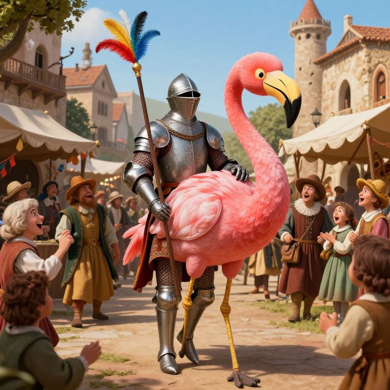 Envision a whimsical world merging Renaissance artistry with Dr. Seuss's imaginative flair, where humans and mythical creatures coexist harmoniously. Imagine a grand procession through a bustling medieval market, led by a knight in gleaming armor astride an oversized talking Flamingo. The scene radiates warmth and joy, with a vibrant color palette that brings the intricate details of Renaissance attire and architecture to life. This captivating image celebrates the unique fusion of historical realism and playful imagination as the talking Flamingo playfully carries the knight's lance, decorated with feathers, evoking laughter and amazement from the market-goers surrounding them.