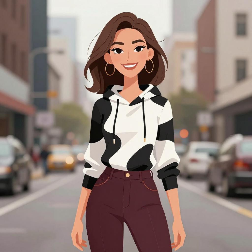 Woman with pretty face and pretty hair. smiling Woman, modern urban, black and white abstract print hoodie with cowl neck, long sleeves with black cuffs, burgundy faux leather pants, skinny fit, mid-rise with horizontal zip pockets. --sref 1467