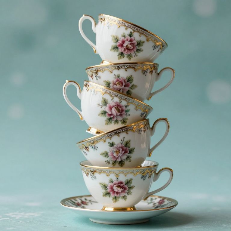 Five ornate teacups, each uniquely decorated with floral patterns and gold accents, are meticulously stacked upside-down atop one another, creating a delicate tower that defies gravity against a soft, bokeh-lit teal background.