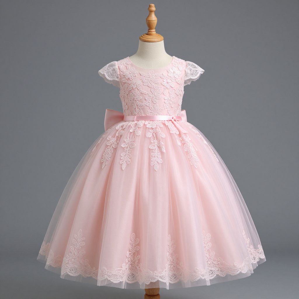 Elegant pink lace and tulle princess dress displayed on a wooden mannequin, featuring a floral bodice and voluminous skirt, perfect for children's formal events and ceremonies.