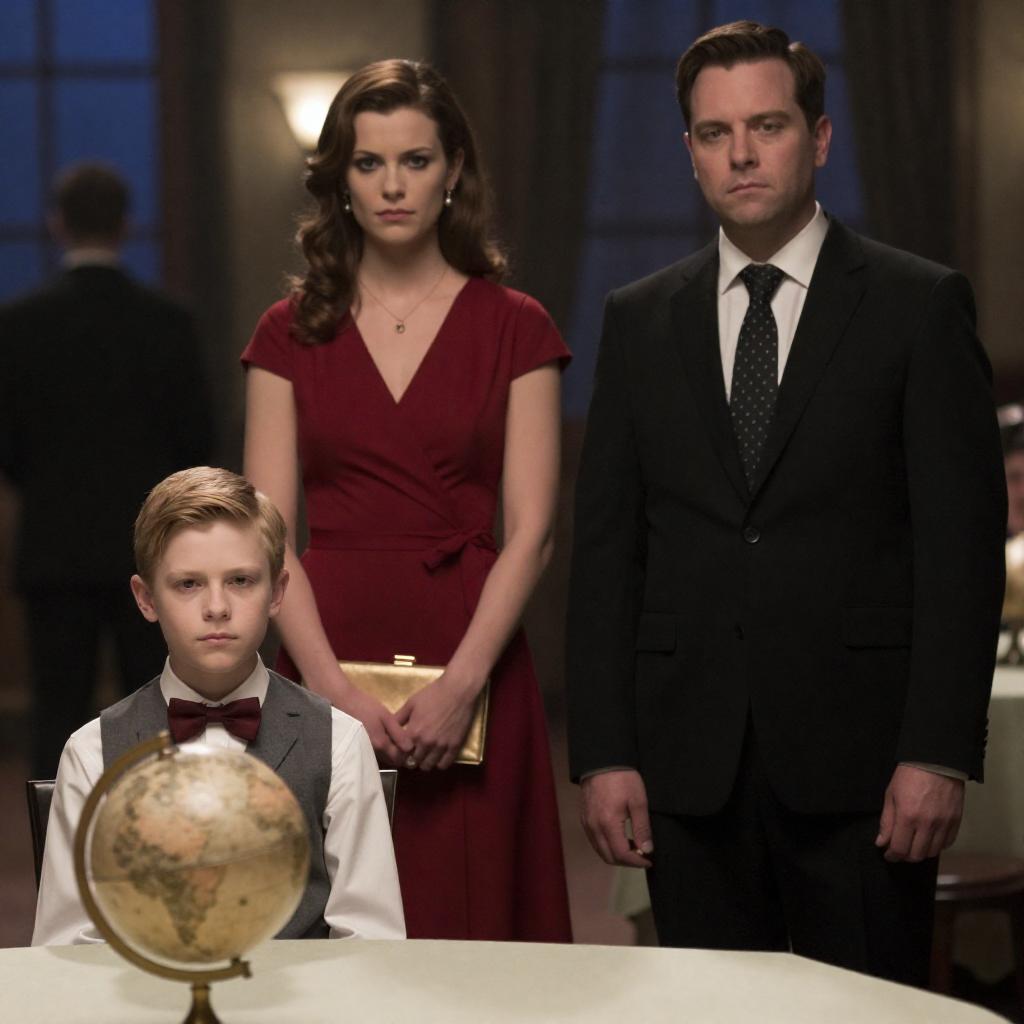 Photograph of three people in a dimly lit room. A blonde boy in a gray vest and bow tie sits at a table with a glass globe. A woman in a red dress stands behind him, holding a gold clutch. A man in a black suit and polka dot tie stands to the right. Blurred background with people and lights. Boy's expression is neutral, woman's expression is serious, man's expression is neutral.