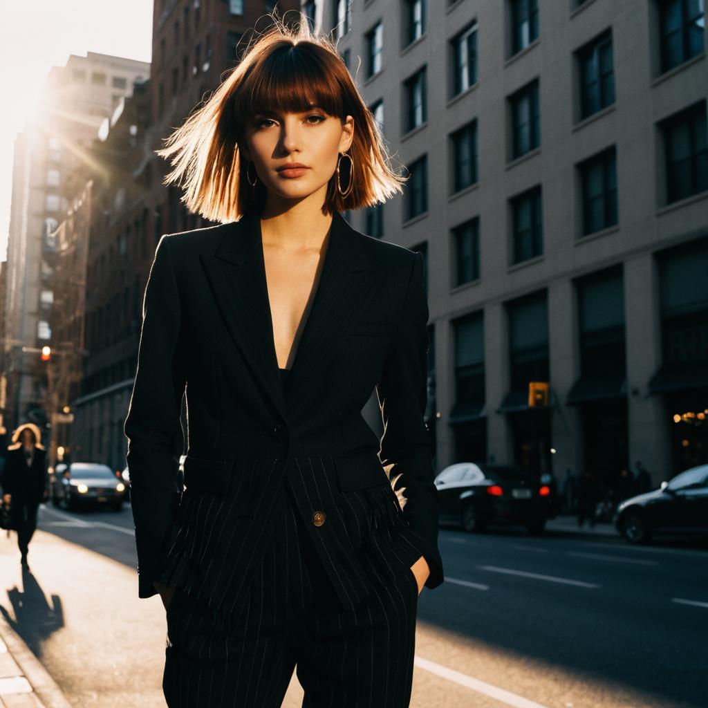 Short Fringe hairstyle on female model, wearing tailored suit, in urban street, captured in fashion editorial style with dramatic shadows.
