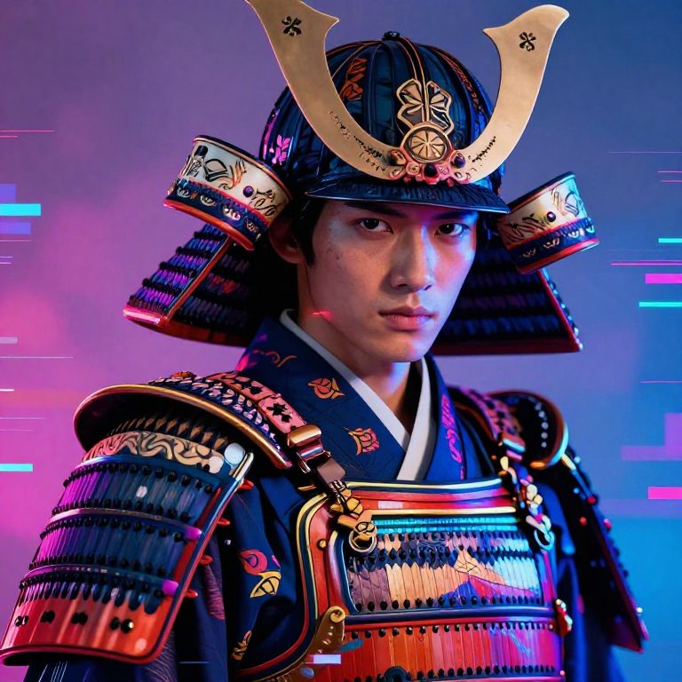 Portrait of Asanagi with a blend of ancient samurai aesthetics and modern cyberpunk elements, vibrant neon colors highlighting intricate armor patterns, intense gaze, digital glitch effects around the edges, blending tradition with technology.