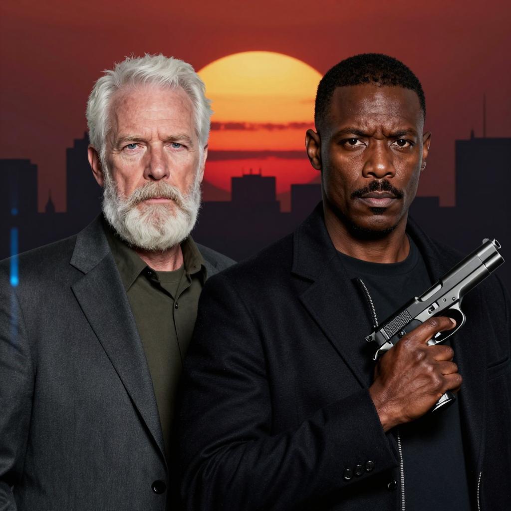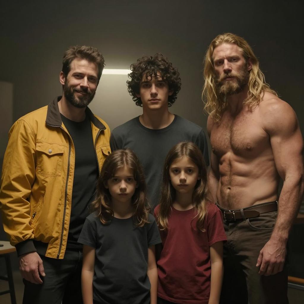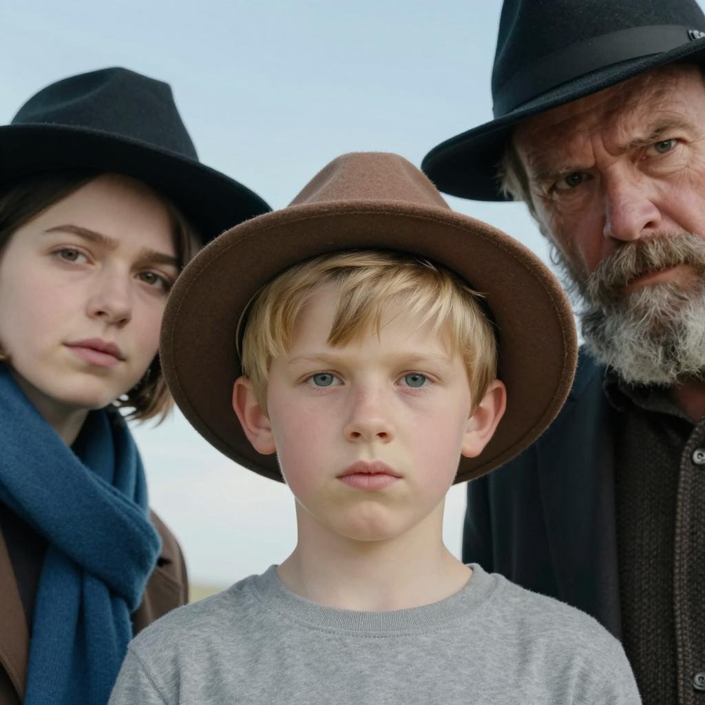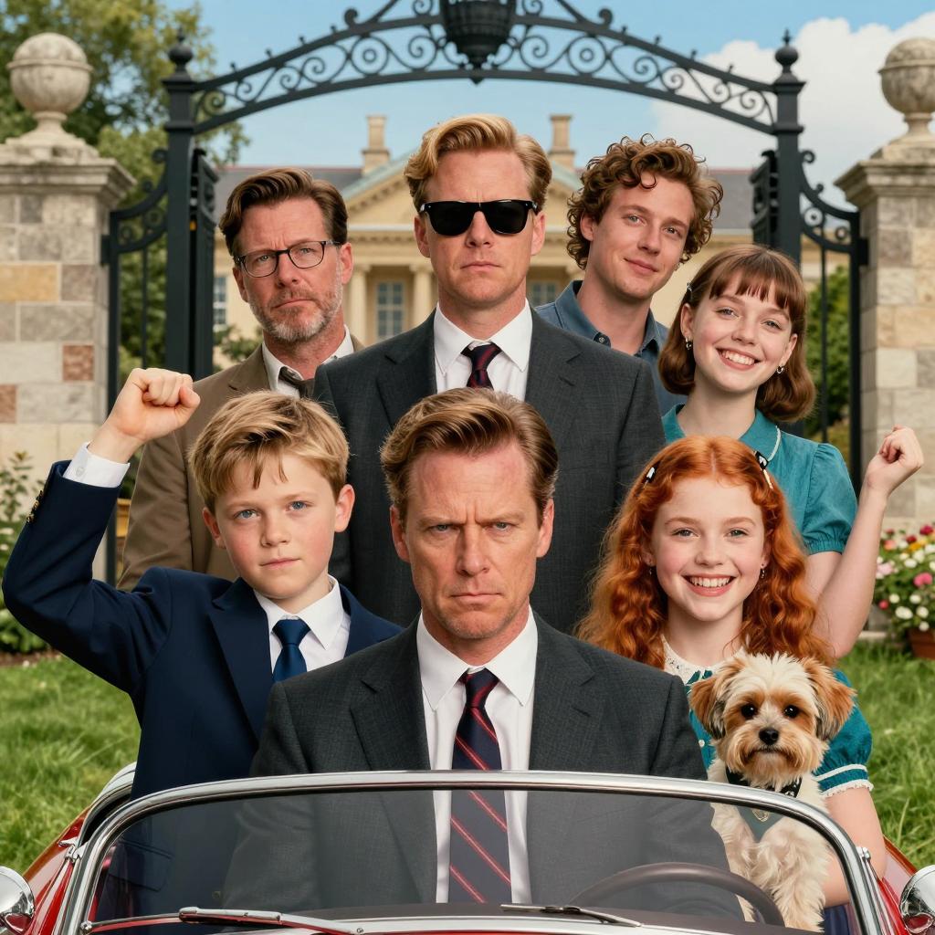 Photograph of a movie poster. Front: blonde-haired girl in red shirt with outstretched hand. Background: grown man with mustache, child in blue shirt, large hand reaching down. Cityscape with lightning, car, and ghostly figures.