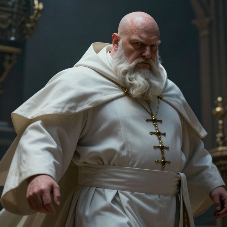 Bald priest, very fat, white beard, priest robes, cleric, approaching perfection, dynamic, smooth, sharp focus, art by Carne Griffiths and Wadim Kashin, sharp focus, by greg rutkowski, mysterious, epic, cinematic, digital art
