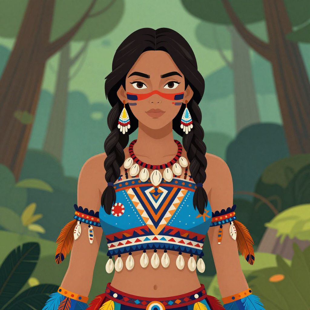 Digital illustration of a Native American woman with dark skin, black braids, red face paint, and colorful traditional tribal attire, standing in a lush forest