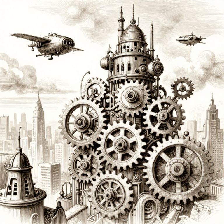 Detailed sepia-toned drawing of a steampunk cityscape featuring large mechanical gears integrated into a tall tower. Two flying machines hover near the structure, set against a cloudy urban skyline with various buildings. The artwork emphasizes texture and depth through fine crosshatching techniques.