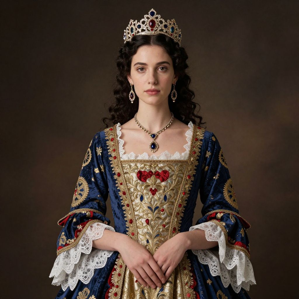 Photograph of a fair-skinned woman with dark, curly hair wearing an ornate, royal-style dress. The dress is deep blue with gold and red embroidery, featuring puffed sleeves with white lace. She has a jeweled crown, necklace, and matching earrings. Her hands are gracefully clasped in front of her. The background is a plain, dark brown gradient. She looks poised and elegant.
