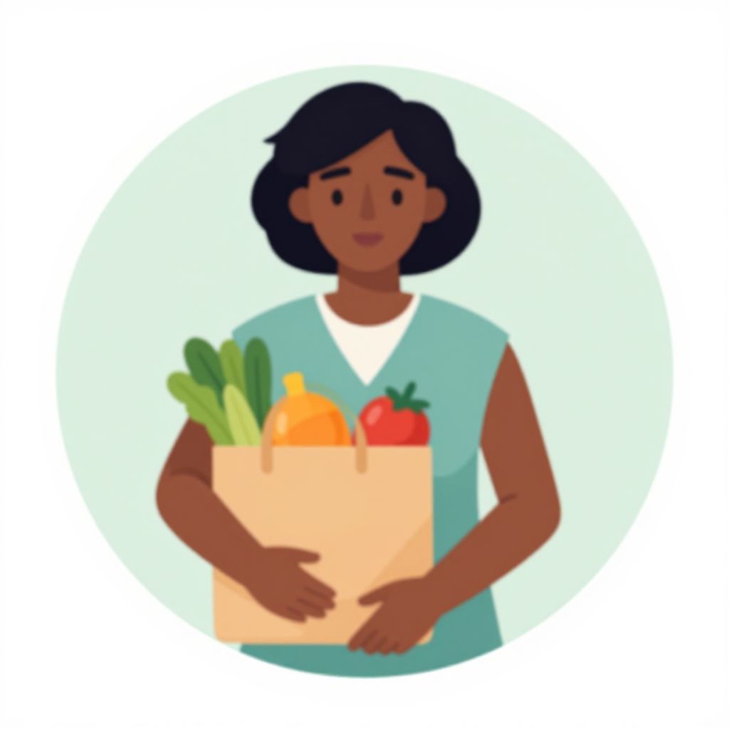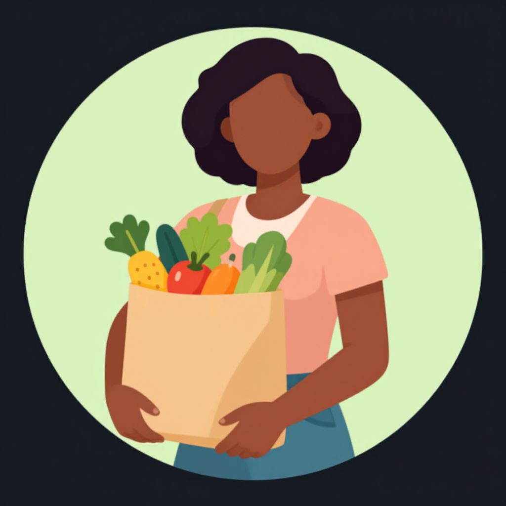 Digital illustration of a dark-skinned woman with short black hair, wearing a light blue sleeveless top, holding a paper bag filled with fresh vegetables and